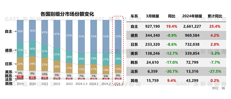 乘用車國(guó)別維度:自主品牌份額連續(xù)3月保持55%