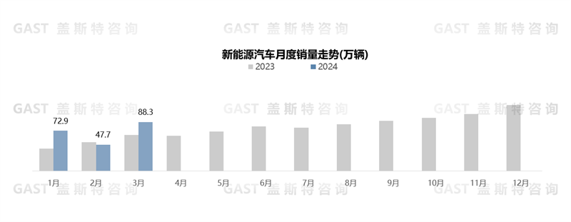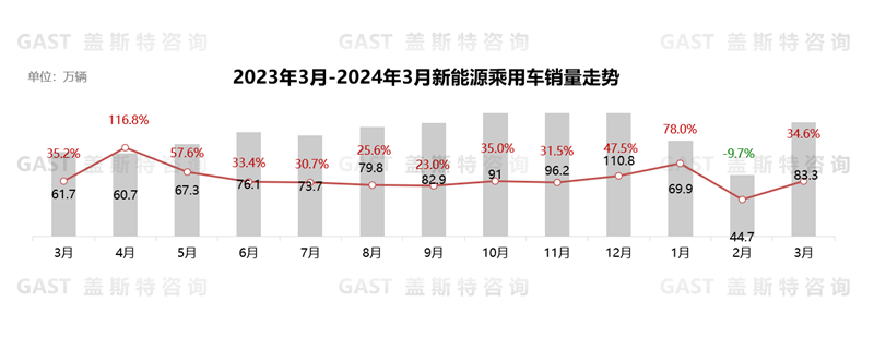 3月,新能源乘用車?yán)塾?jì)銷售83.3萬(wàn)輛,同比增長(zhǎng)34.6%,環(huán)比增長(zhǎng)84.1%。由于政府及各地方以舊換新的政策陸續(xù)發(fā)布、NEV促銷力度加大,消費(fèi)者觀望情緒有所緩解,NEV單月銷量再度突破80萬(wàn)。