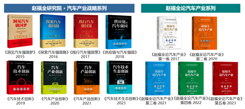 趙福全研究院·汽車產(chǎn)業(yè)戰(zhàn)略系列:現(xiàn)已推出《洞見汽車強國夢》《探索汽車強國路》《踐行汽車強國策》《供應(yīng)鏈與汽車強國》《汽車技術(shù)創(chuàng)新》《汽車產(chǎn)業(yè)創(chuàng)新》《汽車產(chǎn)品創(chuàng)新》《汽車技術(shù)生態(tài)創(chuàng)新》8部。該系列叢書的每本著作都包含了“高端對話”和“論道車界”兩部分內(nèi)容,前者精心編輯收錄了趙教授與多位行業(yè)重量級嘉賓在“趙福全研究院”欄目碰撞思想的深入對話,后者則進一步將這些對話進行系統(tǒng)梳理和深度加工,編撰形成了相關(guān)關(guān)鍵主題的認識論、方法論和實踐論,持續(xù)得到了業(yè)界的廣泛關(guān)注和高度認可。