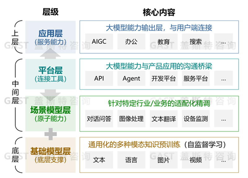 在此應(yīng)用范式下,新的軟件應(yīng)用不再需要從最底層開(kāi)始重復(fù)開(kāi)發(fā),而是基于已有的基礎(chǔ)模型與場(chǎng)景模型便可實(shí)現(xiàn)高效的應(yīng)用開(kāi)發(fā)。因此大模型將重構(gòu)各行業(yè)的軟件體系,不僅有效降低AI模型及軟件應(yīng)用的開(kāi)發(fā)門(mén)檻,提高軟件開(kāi)發(fā)和硬件優(yōu)化的效率,還將重塑企業(yè)經(jīng)營(yíng)管理模式,并拓展豐富其產(chǎn)業(yè)應(yīng)用邊界與賦能形態(tài)。蓋斯特咨詢認(rèn)為,未來(lái)各行業(yè)的所有軟件都可以用大模型重寫(xiě)一遍,實(shí)現(xiàn)軟件價(jià)值效率的革命性提升,賦能各行業(yè)發(fā)展。