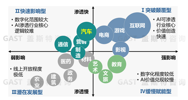 對(duì)于具體行業(yè)而言,其聯(lián)網(wǎng)程度、數(shù)字化基礎(chǔ)、行業(yè)內(nèi)容特點(diǎn)等決定大模型的應(yīng)用前景與價(jià)值。蓋斯特咨詢按照“影響程度”與“滲透速度”兩個(gè)維度,將大模型變革行業(yè)的前景分為四類(詳見(jiàn)圖4):