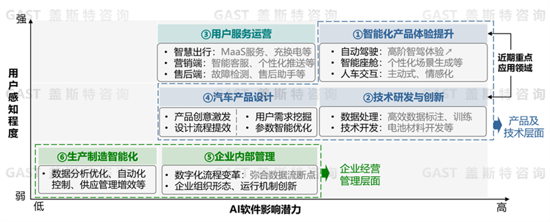 對(duì)于大模型在汽車行業(yè)的應(yīng)用場(chǎng)景和應(yīng)用價(jià)值,我們可從“用戶感知程度”和“AI軟件影響潛力”兩個(gè)維度來(lái)判斷分析。如圖5所示,應(yīng)用場(chǎng)景可分為產(chǎn)品與技術(shù)、用戶服務(wù)運(yùn)營(yíng)、企業(yè)經(jīng)營(yíng)管理三大方面的6個(gè)細(xì)分領(lǐng)域。其中,產(chǎn)品及技術(shù)方面包括智能化體驗(yàn)、技術(shù)研發(fā)創(chuàng)新、產(chǎn)品設(shè)計(jì),大模型的應(yīng)用價(jià)值將率先體現(xiàn)在智能化產(chǎn)品提升與技術(shù)研發(fā)創(chuàng)新上,這是行業(yè)當(dāng)前重點(diǎn)關(guān)注領(lǐng)域;服務(wù)運(yùn)營(yíng)是用戶感知程度較強(qiáng)的領(lǐng)域,其中營(yíng)銷、售后、城市出行等場(chǎng)景均可利用大模型進(jìn)行賦能;在企業(yè)經(jīng)營(yíng)管理方面,大模型在生產(chǎn)制造智能化、企業(yè)數(shù)字化流程變革及組織形態(tài)創(chuàng)新等發(fā)揮作用,通過(guò)彌合數(shù)據(jù)流斷點(diǎn)、提升自動(dòng)化程度、優(yōu)化組織機(jī)制等實(shí)現(xiàn)企業(yè)經(jīng)營(yíng)的降本增效。