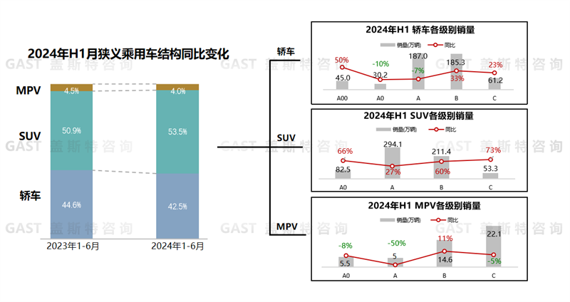 轎車份額為42.5%,同比下滑2.1個百分點。A00級同比增幅較大;A0級與A級同比下滑,A0級中海豚同比下滑幅度超過50%;B級與C級同比增長,C級中極氪001、小米SU7貢獻主要增量。
