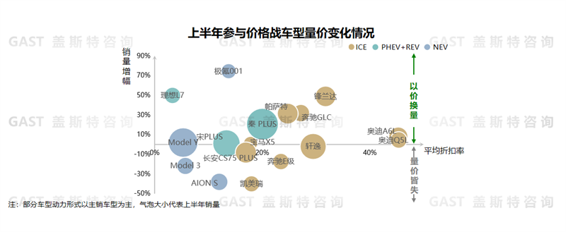 從降價幅度看,NEV降價較去年更主動,主流市場降幅較去年有所擴大,ICE普遍維持去年高降價幅度;從降價效果看,價格戰(zhàn)對于整體乘用車市場銷量的拉升作用有限,特別是燃油車型,部分車型處于“量價皆失”狀態(tài)。