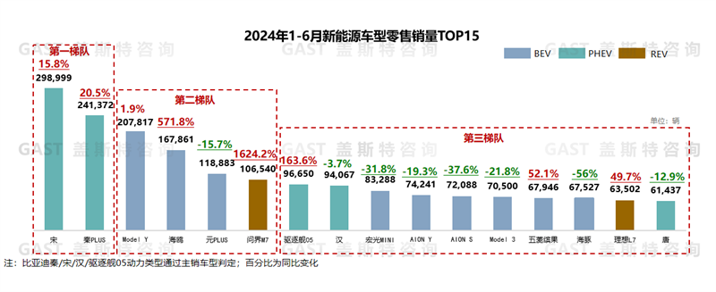 上半年,TOP15車型中超半數(shù)車型銷量出現(xiàn)同比下滑,其中宏光MINI、AION S及海豚三款車型降幅超30%。具體來看,宋和秦Plus:宋家族和秦PLUS榮耀版車型的推出,帶動兩大車型上半年銷量同比兩位數(shù)增長;Model Y:受國內競品增多影響,銷量增速大幅放緩;海鷗:月均銷量超過2.7萬輛;問界M7:隨著新M7 Ultra上市交付,成為上半年中大型SUV銷量第一的車型;驅逐艦05:隨著榮耀版上市,銷量同比大幅增長;宏觀MINI:A00級市場競爭加劇,銷量下滑明顯;AION S:排名下滑至A級純電轎車第二位。