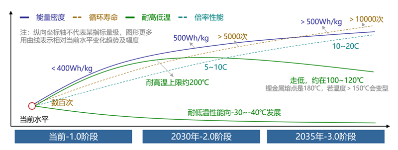 在2.0階段(即到2030年),正極材料以硫碳復(fù)合、富鋰錳基為主,負(fù)極材料為鋰合金或鋰負(fù)極,電解質(zhì)采用氧化物復(fù)合、硫化物或鹵化物,追求達(dá)到500Wh/kg的高能量密度指標(biāo)。