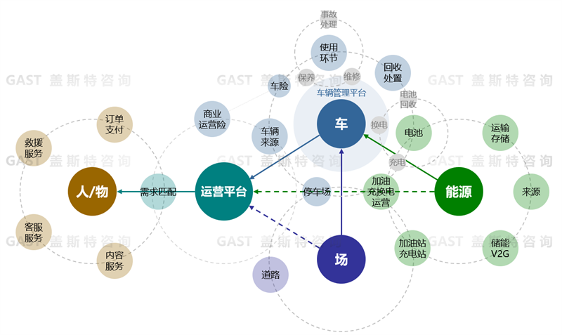 需要注意的是,構(gòu)建生態(tài)是布局未來(lái)移動(dòng)出行商業(yè)模式的關(guān)鍵。圖7展現(xiàn)了未來(lái)移動(dòng)出行生態(tài)的要素和要素間關(guān)系,其中有三大核心生態(tài)要素:一是供需交互的平臺(tái),二是給車(chē)提供的支撐性服務(wù),三是給人提供的服務(wù)。其中供需交互的平臺(tái)即為圖中的運(yùn)營(yíng)平臺(tái),它連接人/物、車(chē)、場(chǎng)、能源,在高級(jí)別自動(dòng)駕駛運(yùn)營(yíng)模式中,車(chē)和運(yùn)營(yíng)平臺(tái)密不可分,運(yùn)營(yíng)中獲取的數(shù)據(jù)可用于提升自動(dòng)駕駛能力,所以車(chē)企應(yīng)重點(diǎn)關(guān)注運(yùn)營(yíng)平臺(tái)的建設(shè)和運(yùn)維。