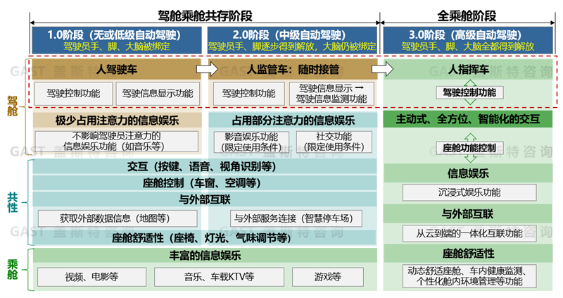 如前所述,基于自動駕駛技術(shù)的不同成熟度,蓋斯特將智能座艙劃分為三個發(fā)展階段,具體如圖1所示。