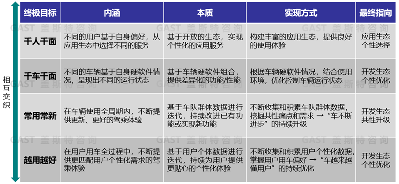 如表1所示,“千人千面”是指不同的用戶在車內(nèi)基于自身偏好,從應(yīng)用生態(tài)中選擇不同的服務(wù)。其本質(zhì)是基于開放的生態(tài),實現(xiàn)個性化的應(yīng)用服務(wù)。為此,車企要和相關(guān)開發(fā)商、內(nèi)容商、服務(wù)商等合作,共同構(gòu)建豐富的應(yīng)用生態(tài),最終使每一個用戶都擁有享受不同服務(wù)組合的自由??梢?,“千人千面”最終指向的是智能汽車為用戶提供個性化服務(wù)的應(yīng)用生態(tài)。而“千車千面”是指不同的車輛基于自身硬軟件情況,呈現(xiàn)出不同的運(yùn)行狀態(tài)。其本質(zhì)是基于車輛的硬件配置及其與相關(guān)軟件的組合,使不同的車輛為用戶提供差異化的功能/性能。為此,車企要根據(jù)每臺車硬件的配置及使用情況,如預(yù)留、老化和更換等,并結(jié)合軟件在不同運(yùn)行條件(車輛使用環(huán)境等)下對這些硬件的控制和優(yōu)化情況,使每一臺車的駕乘特性都呈現(xiàn)出與自身硬軟件相匹配的差異化??梢?,“千車千面”最終指向的是智能汽車的開發(fā)生態(tài)以及車輛運(yùn)行中的個性優(yōu)化。