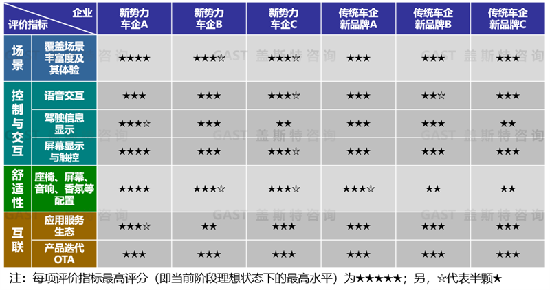 表2給出了部分主流車企的評價結(jié)果,包括三家新勢力車企和三家傳統(tǒng)車企的新能源品牌。在評價時分別選取了各家車企的1-2款代表性車型,其中新勢力車企的車型價位在30萬-40萬元之間,而傳統(tǒng)車企的車型價位在20萬元左右;這些車型產(chǎn)品均已具備了L2+自動駕駛(高速或/和城市領(lǐng)航)能力,也就是說,其座艙大致處于相近的發(fā)展階段。
