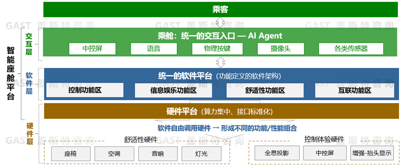 如圖3所示,全乘艙階段智能座艙理想的技術(shù)架構(gòu)將演化為硬件層、軟件層和交互層,而交互層、軟件層和硬件層內(nèi)算力集中化、接口標(biāo)準(zhǔn)化的硬件平臺,將共同構(gòu)成智能座艙平臺,并全面覆蓋各種功能硬件。該技術(shù)架構(gòu)有三大特點:一是統(tǒng)一的交互入口。隨著人工智能技術(shù)的不斷進(jìn)步,汽車將逐步成為智能體,即所謂的AI Agent。這個AI Agent將統(tǒng)領(lǐng)汽車所有軟硬件,實現(xiàn)座艙的全感融合、全局規(guī)劃和全域執(zhí)行,像用戶的貼心管家和長期伴侶一樣,與用戶進(jìn)行多模交互,并全權(quán)代為管理座艙,為用戶提供主動式、個性化的精準(zhǔn)服務(wù)和情感體驗。二是統(tǒng)一的軟件平臺。在形式上按照功能有不同分區(qū),但在本質(zhì)上其架構(gòu)是由功能定義的,且這些功能可以完全打通及融合。三是充分的軟硬解耦。即不同的軟件可以自由調(diào)用各種功能硬件,以形成不同的功能/性能及其組合。例如座椅位置和姿態(tài)、音響效果、燈光模式等都可以通過軟件控制而任意變化,按照用戶需求提供個性化的會議、家庭影院等模式。