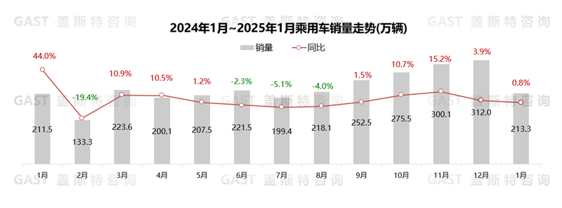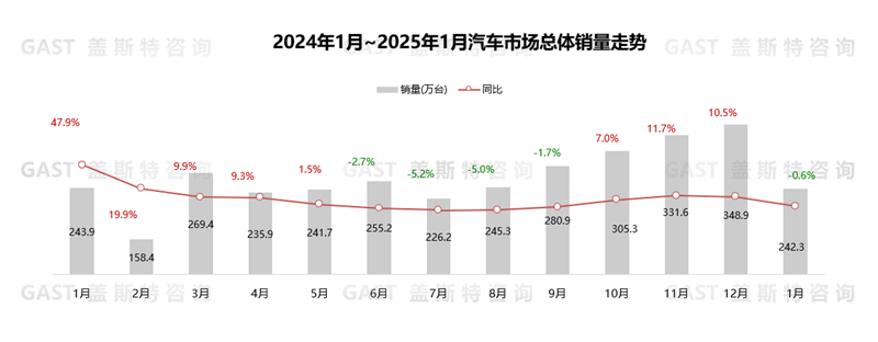 2025年1月,中國汽車市場銷售242.3萬輛,同比下降0.6%,環(huán)比下降30.5%。春節(jié)月提前導致去年同期基數(shù)偏高,且2024年以舊換新政策透支部分消費需求,使得1月整體汽車市場銷量同比小幅下滑。