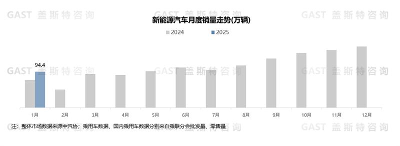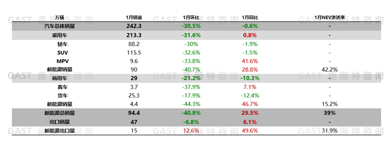 1月,新能源汽車銷售94.4萬輛,同比增長29.5%。從滲透率角度看,1月全市場新能源滲透率達39.2%,其中乘用車市場新能源滲透率達42.2%。