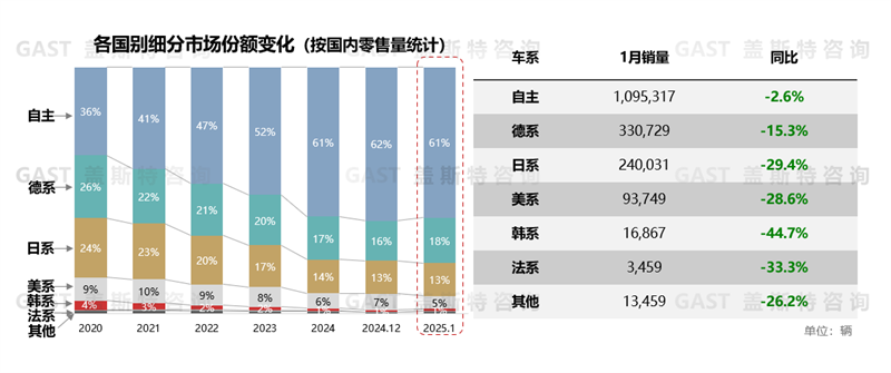 同比增幅角度,1月各國別車系同比均呈下滑態(tài)勢。