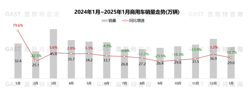 1月,商用車銷售29萬輛,環(huán)比下降21.2%。受春節(jié)月及車企年末沖刺銷量影響,2024年末購車需求提前釋放,且宏觀經(jīng)濟未有明顯改善,使得整體商用車銷量同比下降10.3%。