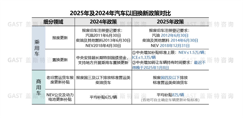 1月8日,為穩(wěn)定市場預期,避免政策“斷檔”,國家發(fā)布《關(guān)于2025年加力擴圍實施大規(guī)模設(shè)備更新和消費品以舊換新政策的通知》。《通知》明確了置換更新補貼標準,擴大了報廢更新支持范圍。