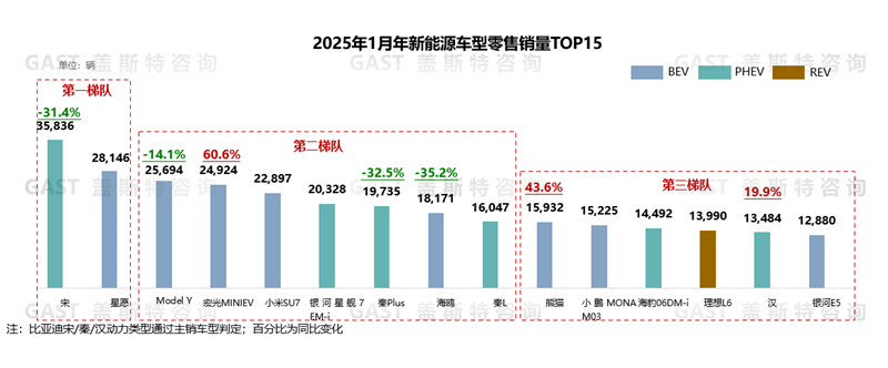 1月,比亞迪及吉利在TOP15車型中分別占據(jù)6席和4席。同時,A級及以下純電市場表現(xiàn)回暖,TOP15車型中占據(jù)8席。具體來看:宋系列同比銷量下滑超30%,但仍然保持銷量斷層領(lǐng)先;星愿:吉利新工廠開始量產(chǎn)星愿,產(chǎn)能大幅提升,單月銷量創(chuàng)歷史新高;Model Y:新款暫未交付且其生產(chǎn)線調(diào)整,導致Model Y銷量同比下滑14%;小米SU7:產(chǎn)能持續(xù)爬坡,連續(xù)4個月銷量超過2萬輛;銀河星艦7 EM-i:連續(xù)兩個月交付量保持在2萬輛左右;熊貓:1月采取降價措施,最高降幅達1萬元,銷量同比增長超40%;小鵬1月份實施國補兜底政策,助推MONA M03連續(xù)兩個月銷量超過1.5萬輛;銀河E5:優(yōu)惠政策延期,月銷量穩(wěn)定在1.2萬輛以上。