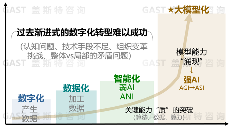 具體對于企業(yè)來說,基礎(chǔ)的數(shù)字化是前提,企業(yè)進(jìn)而基于數(shù)據(jù)化發(fā)展智能化,但是以往的智能化更多是以弱AI(ANI)為主,即通過一個模型、一套算法來解決一個特定的問題,這意味著ANI只能做特定的某一件事,屬于一種“就事論事”、潛力有限的方式。這也是很多企業(yè)過去漸進(jìn)式的數(shù)字化轉(zhuǎn)型難以取得成功的重要原因。目前大模型實現(xiàn)AI技術(shù)“質(zhì)”的突破,其具備通用性、強(qiáng)泛化、生成式、自學(xué)習(xí)等特征,能夠自我進(jìn)化、自我創(chuàng)造,因此成為數(shù)據(jù)要素創(chuàng)造價值的最短路徑,代表當(dāng)前利用數(shù)據(jù)的核心能力與最高境界,從而引領(lǐng)新一輪的智能化轉(zhuǎn)型。