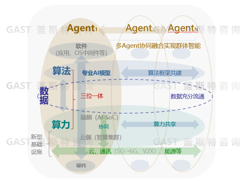 以AI為代表的新一輪智能化將給社會全行業(yè)帶來新發(fā)展范式和新生態(tài)。對于汽車產(chǎn)業(yè)來說,目前在硬件、軟件、數(shù)據(jù)的共同作用下發(fā)展初級智能,未來在AI主導(dǎo)的大智能產(chǎn)業(yè)賦能下將被全面重構(gòu):第一,一切硬件都會被驅(qū)動,賦予新智能化能力,實現(xiàn)價值最大化;第二,一切軟件都會被重構(gòu),形成類人腦的方式,通過AI實現(xiàn)對多軟件的統(tǒng)領(lǐng)、管理和替代,最終AI也將與現(xiàn)有軟件體系融為一體;第三,一切的數(shù)據(jù)都會被激活,實現(xiàn)數(shù)據(jù)自由流動,發(fā)揮協(xié)同效應(yīng),從而創(chuàng)造全新的價值。所以,汽車產(chǎn)業(yè)在大智能時代“數(shù)據(jù)+算法+算力”三位一體賦能之下,整體發(fā)展范式將實現(xiàn)Agent(智能體)化重構(gòu)。