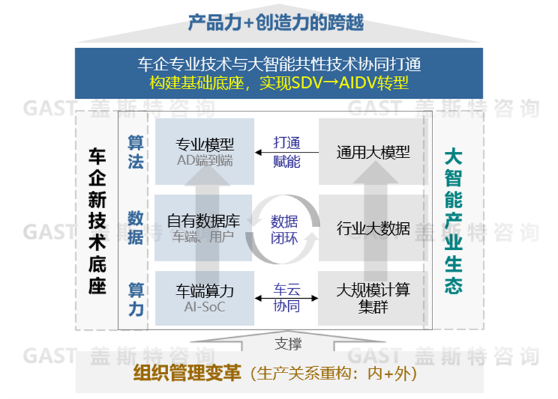 一方面在技術(shù)能力上,車企需將本身的專業(yè)技術(shù)和大智能領(lǐng)域的共性技術(shù)打通,協(xié)同構(gòu)建基礎(chǔ)技術(shù)底座,由SDV(軟件定義汽車)向AIDV(AI定義汽車)轉(zhuǎn)型。轉(zhuǎn)型核心在于圍繞算法、數(shù)據(jù)、算力的專業(yè)技術(shù)能力,如何與大智能產(chǎn)業(yè)有效協(xié)同,并建立面向AIDV的新能力。具體來說,一是算法上,企業(yè)模型如何做到“老樹開新花”?也就是說,如何在原有算法積累上、基于大模型實現(xiàn)能力的質(zhì)變?二是數(shù)據(jù)上,車企如何確保數(shù)據(jù)受控?如何保證高質(zhì)量數(shù)據(jù)的獲取與可持續(xù)迭代?如何做到企業(yè)數(shù)據(jù)與行業(yè)數(shù)據(jù)協(xié)同共創(chuàng)?三是算力上,車企如何有效布局算力資源?車企是否需要自建算力設(shè)施?如何充分利用外部算力資源?又如何推進(jìn)內(nèi)外部算力協(xié)同部署?上述能力大多是車企現(xiàn)在并不具備的新技術(shù),又恰恰是ICT企業(yè)、大智能生態(tài)里的專業(yè)公司所擅長的,因此車企需協(xié)同大智能生態(tài)獲取自身不具備的新技術(shù)能力。