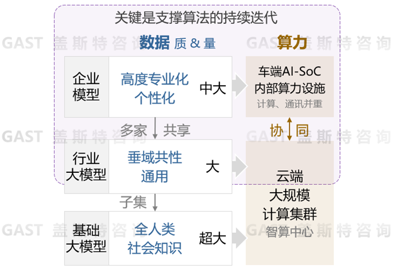 過去車企在算法積累上更多依靠的是研發(fā)人員數(shù)量,而大模型框架下的成本則主要在于數(shù)據(jù)與算力資源的投入,那么車企如何有效掌控不同類別的數(shù)據(jù)、有效協(xié)同外部算力資源以支撐算法的持續(xù)迭代變得至關(guān)重要。所以車企應(yīng)該主導(dǎo)數(shù)據(jù)和算力協(xié)同體系建設(shè)。