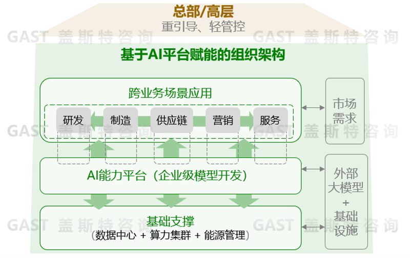 蓋斯特研究團(tuán)隊研究由AI驅(qū)動的企業(yè)組織管理形態(tài),展望其理想圖景,具體如圖7所示。未來一定是基于AI平臺賦能的組織架構(gòu),通過共性能力平臺、企業(yè)級模型的開發(fā),來實現(xiàn)跨業(yè)務(wù)場景的打通及數(shù)據(jù)流的充分流轉(zhuǎn),達(dá)到整體組織能力的“涌現(xiàn)”。