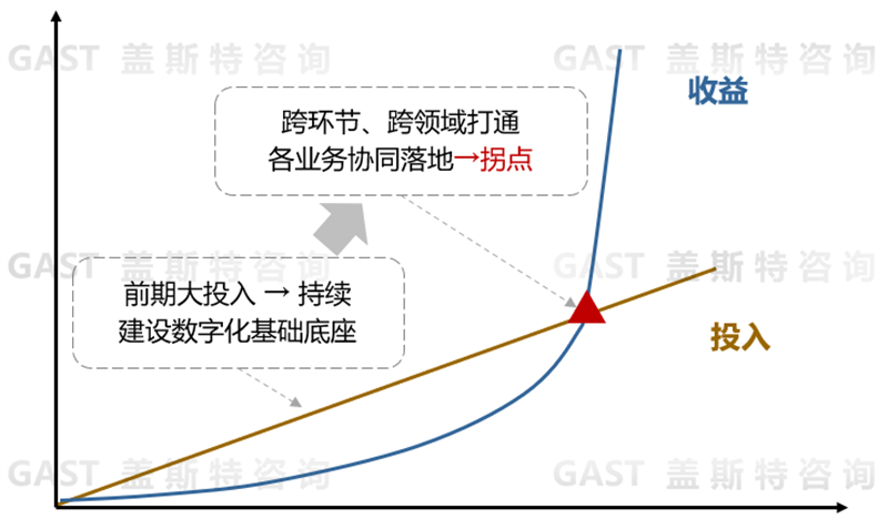 第一,車企需要正確認(rèn)識智能化轉(zhuǎn)型的總體發(fā)展規(guī)律。智能化轉(zhuǎn)型是長期過程,前期企業(yè)投入巨大,需要持續(xù)建設(shè)數(shù)字化的基礎(chǔ)底座,此時收益并不明顯;隨著多方面舉措逐步疊加,等積累到一定程度而達(dá)到拐點,即跨環(huán)節(jié)、跨領(lǐng)域充分打通,各業(yè)務(wù)協(xié)同落地,此時轉(zhuǎn)型收益急速提升,如圖8所示。特別需要提醒的是,智能化轉(zhuǎn)型的投入與收益并非是平行線的關(guān)系,因此車企需要堅定而持續(xù)地投入,才能收獲良好的效果。