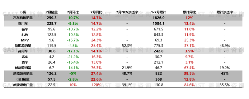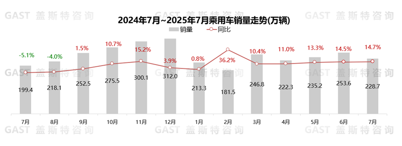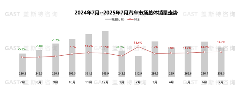 2025年7月,中國(guó)汽車(chē)市場(chǎng)銷(xiāo)售259.3萬(wàn)輛,環(huán)比下降10.7%,同比增長(zhǎng)14.7%。具體來(lái)看,“以舊換新”和地方促消費(fèi)政策的效果持續(xù)釋放,同時(shí)部分車(chē)企仍維持較高促銷(xiāo)力度,疊加NEV新車(chē)銷(xiāo)量持續(xù)爬坡上量,多重因素共同作用下,7月整體市場(chǎng)同比增速仍維持在兩位數(shù)的較高水平。
