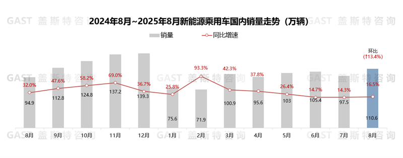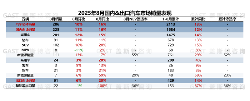 2025年8月,中國汽車市場銷售285.7萬輛,環(huán)比增長10.1%,同比增長16.4%。具體來看,在“兩新”政策及地方普惠性政策的協(xié)同發(fā)力下,國內(nèi)NEV市場同環(huán)比增速均高于整體市場;同時(shí),汽車出口維持高增長態(tài)勢,進(jìn)一步為8月市場的回升注入強(qiáng)勁動(dòng)力。