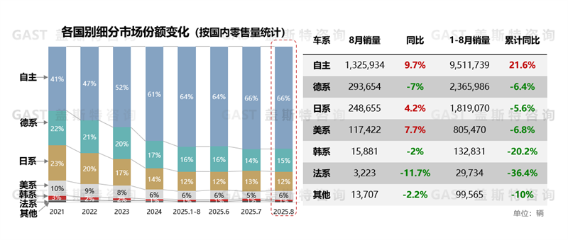 市場份額角度,8月自主品牌市場份額維持在66%,環(huán)比7月小幅下滑0.2個(gè)百分點(diǎn)。