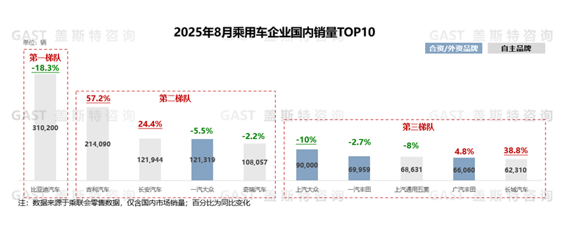 8月,TOP10中自主品牌占據(jù)6席,其中吉利、長安、長城保持同比兩位數(shù)高增長;反觀合/外資品牌,僅廣汽豐田實(shí)現(xiàn)正增長。具體來看,比亞迪:受吉利、零跑等競企沖擊,國內(nèi)市場銷量同比大幅下滑,8月份額為15.4%,同比下滑4.5個(gè)百分點(diǎn);吉利:8月國內(nèi)銷量同比超50%增長,單月市場份額達(dá)10.6%,同比增長3.5個(gè)百分點(diǎn);長安:國內(nèi)NEV銷量超7萬輛,同比增長81%,其中啟源國內(nèi)銷量超3.2萬輛;奇瑞:國內(nèi)銷量同比小幅下滑,其中NEV銷量近7萬輛,同比增長8.4%;主銷燃油車國內(nèi)銷量同比下滑,疊加NEV車型表現(xiàn)不佳,8月上汽大眾同比兩位數(shù)下滑;廣汽豐田:國內(nèi)銷量同比小幅增長,除一口價(jià)政策帶動(dòng)終端需求外,鉑智3X銷量創(chuàng)歷史新高;長城:國內(nèi)銷量同比增長超38%,哈弗品牌憑借多款車型上市拉動(dòng),單月銷量同比增長近50%。