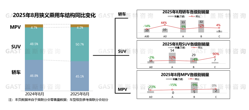 MPV份額為4.2%,同比下降0.5個(gè)百分點(diǎn)。低端及B級(jí)市場表現(xiàn)不佳。C級(jí)市場相對穩(wěn)定,別克GL8單月銷量維持在1萬輛左右;8月末全新騰勢D9上市,銷量拉動(dòng)作用尚未顯現(xiàn);2026款嵐圖夢想家于9月上市,8月銷量小幅回落;高山銷量連續(xù)三個(gè)月穩(wěn)定在5千輛以上。