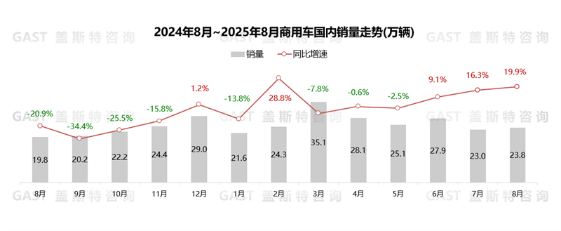 8月,商用車國內(nèi)銷售23.8萬輛,環(huán)比增長3.4%,同比增長19.9%。由于去年同期基數(shù)較低,且政策推動(dòng)NEV商用車同比增長59%,多重因素共同作用下,國內(nèi)商用車市場實(shí)現(xiàn)同比高增長。
