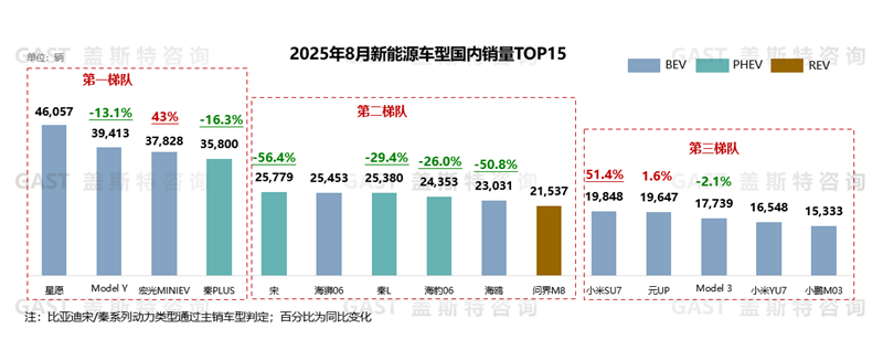 8月,比亞迪在TOP15中占據(jù)7席,仍保持?jǐn)鄬宇I(lǐng)先;從動(dòng)力形式看,TOP15中純電車型占據(jù)10席。具體來看,吉利星愿:銷量連續(xù)8個(gè)月保持正增長,8月再創(chuàng)歷史新高;宏光MINI EV:8月同環(huán)比增幅均超過35%,月銷量重返3萬輛以上;宋系列:銷量下滑幅度持續(xù)擴(kuò)大,其中宋PLUS同比下滑超2倍;問界M8:上市后訂單穩(wěn)定增長,且產(chǎn)能持續(xù)爬坡,連續(xù)三個(gè)月銷量突破2萬輛,同時(shí)也成為TOP15車型中唯一價(jià)位在40萬元左右的車型;小米SU7:產(chǎn)能分配上持續(xù)向YU7讓步,銷量已連續(xù)三個(gè)月低于2.5萬輛,8月環(huán)比下滑超18%;Model 3:長續(xù)航版上市且推出五年免息政策,月銷量環(huán)比增長超80%;小米YU7:產(chǎn)能穩(wěn)步提升,上市第二個(gè)完整月銷量突破1.6萬輛。