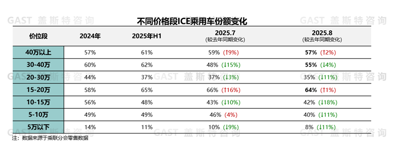 從細(xì)分價(jià)格帶來看,ICE乘用車在15-20萬元及30萬元以上市場延續(xù)了強(qiáng)勢表現(xiàn),細(xì)分市場份額仍超過55%。30萬元以上市場中,BBA等傳統(tǒng)豪華品牌部分車型保持10萬元以上的降價(jià)幅度,目前仍占據(jù)該價(jià)格段60%份額,但隨著自主品牌加速布局豪華市場,預(yù)計(jì)2025年末該區(qū)間ICE份額將下滑至50%以下;15-20萬元市場則因主流合資中高端車型售價(jià)下探、自主NEV布局較少,預(yù)計(jì)2025年末ICE在該區(qū)間仍有望守住60%市場份額。