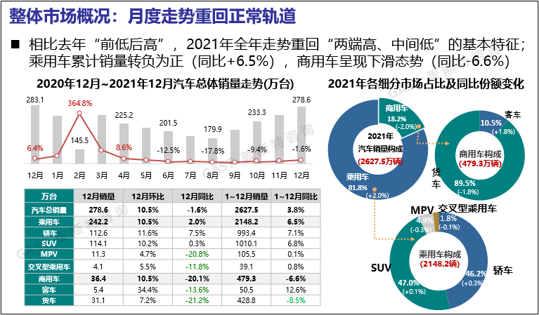 整體市場概況:相比去年“前低后高”,2021年全年走勢重回“兩端高、中間低”的基本特征。乘用車累計銷量轉(zhuǎn)負為正(同比增長6.5%),商用車呈現(xiàn)下滑態(tài)勢(同比下降6.6%)。