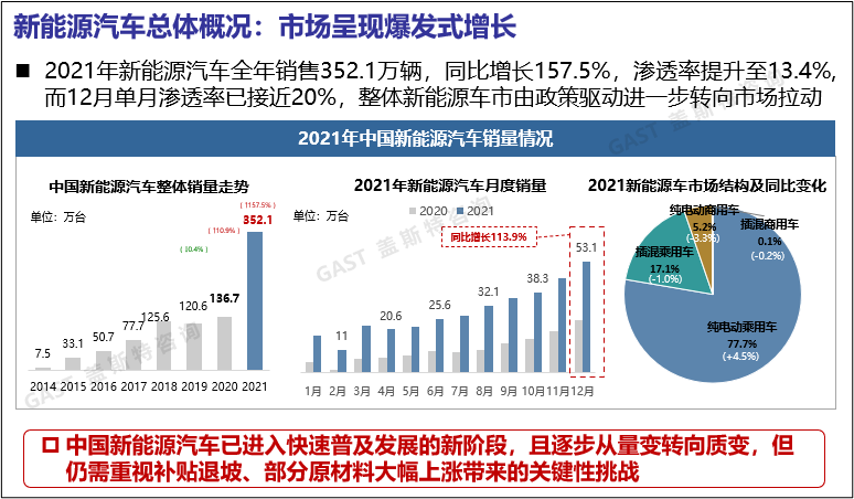 新能源汽車總體概況:從銷量來看,2021年新能源汽車全年銷售352.1萬輛,同比增長157.5%。從滲透率來看,全年滲透率提升至13.4%,而12月單月滲透率已接近20%,整體新能源車市由政策驅(qū)動進一步轉(zhuǎn)向市場拉動。中國新能源汽車已進入快速普及發(fā)展新階段,且逐步從量變轉(zhuǎn)向質(zhì)變,但仍需重視補貼退坡、部分原材料大幅上漲帶來的關鍵性挑戰(zhàn)。