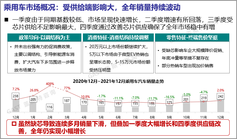 乘用車市場概況:受供給端影響大,全年銷量持續(xù)波動。一季度由于同期基數(shù)較低、市場呈現(xiàn)快速增長,二季度增速有所回落,三季度受芯片供給不足影響最大,四季度通過改善芯片供應確保了全年市場穩(wěn)中有增。雖然缺芯導致連續(xù)多月銷量下滑,但疊加一季度大幅增長和四季度供應鏈改善,全年仍實現(xiàn)小幅增長。