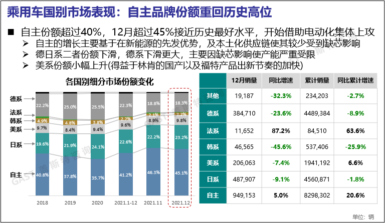 乘用車國別市場表現(xiàn):自主品牌份額重回歷史高位。自主品牌的市場份額全年超過40%,12月超過45%接近歷史最好水平,并開始借助電動化集體上攻。自主品牌市場份額的增長主要基于新能源汽車的先發(fā)優(yōu)勢,及本土化供應鏈使其較少受到缺芯影響;德日系二者份額下滑,其中德系下滑更大,主要受缺芯影響產(chǎn)能嚴重受限;美系份額呈現(xiàn)小幅上升,主要得益于林肯的國產(chǎn)以及福特產(chǎn)品出新節(jié)奏的加快。
