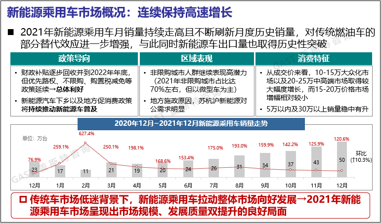 新能源乘用車市場概況:連續(xù)保持高速增長。2021年新能源乘用車市場呈現(xiàn)出市場規(guī)模、發(fā)展質(zhì)量雙提升的良好局面。全年月銷量持續(xù)走高且不斷刷新月度歷史銷量,新能源車對傳統(tǒng)燃油車的部分替代效應進一步增強,與此同時新能源車出口量也取得歷史性突破。