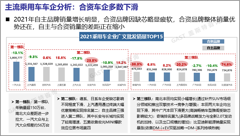 主流乘用車車企分析:合資車企多數(shù)下滑。2021年自主品牌銷量增長明顯,合資品牌因缺芯略顯疲軟,但合資品牌整體銷量優(yōu)勢仍在,自主與合資銷量的差距正在縮小。