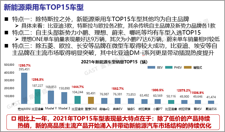 2021年新能源乘用車前十五車型:從品牌來看,除特斯拉外,新能源乘用車TOP15其他車型均為自主品牌,其中自主頭部新勢力小鵬、理想、蔚來、哪吒等均有車型入選TOP15,而自主傳統(tǒng)車企中,五菱、歐拉、長安等品牌在微型車取得較大成功,比亞迪、埃安等品牌在主流市場均取得明顯突破,其中比亞迪DM-i系列更是帶動插混熱度提升。從產(chǎn)品來看,2021年TOP15車型表現(xiàn)相比2020年最大特點在于除了低價的產(chǎn)品持續(xù)熱銷,新的高品質(zhì)主流產(chǎn)品開始涌入并帶動新能源汽車市場結(jié)構的持續(xù)優(yōu)化。