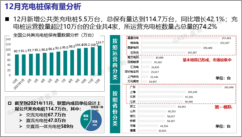 12月充電樁保有量分析:12月新增公共類充電樁5.5萬臺,總保有量達到114.7萬臺,同比增長42.1%;充電樁運營數(shù)量超過10萬臺的企業(yè)共4家,所運營充電樁數(shù)量占總量的74.2%。