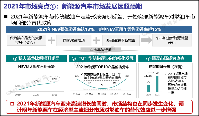 2021年市場亮點一:新能源汽車市場發(fā)展遠超預期。2021年新能源車與傳統(tǒng)燃油車走勢形成強烈反差,開始實現(xiàn)新能源車對燃油車市場的部分替代效應。2021年新能源汽車迎來高速增長,同時市場結(jié)構也在發(fā)生變化,預計明年新能源車在經(jīng)濟型主流細分市場對燃油車的替代效應將進一步增強。