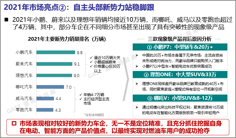 2021年市場亮點二:自主頭部新勢力站穩(wěn)腳跟。2021年小鵬、蔚來以及理想年銷輛均接近10萬輛,而哪吒、威馬以及零跑也超過了4萬輛,其中,部分車企在不同細分市場甚至出現(xiàn)了具有突破性的現(xiàn)象級產(chǎn)品。市場表現(xiàn)相對較好的新勢力車企,無一不是定位精準,且充分抓住挖掘自身在電動、智能方面的產(chǎn)品價值點,以最終實現(xiàn)對燃油車用戶的成功搶奪。