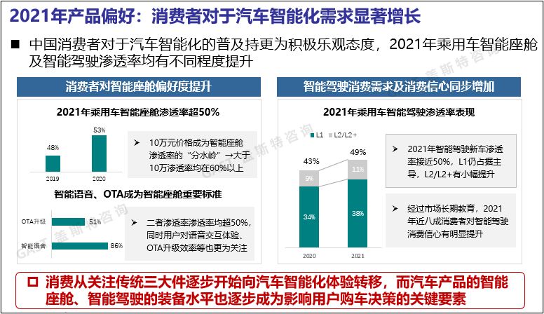 2021年產(chǎn)品偏好:消費者對于汽車智能化需求顯著增長。中國消費者對于汽車智能化的普及持更為積極樂觀態(tài)度,2021年乘用車智能座艙及智能駕駛滲透率均有不同程度提升。消費從關注傳統(tǒng)三大件逐步開始向汽車智能化體驗轉(zhuǎn)移,而汽車產(chǎn)品的智能座艙、智能駕駛的裝備水平也逐步成為影響用戶購車決策的關鍵要素。