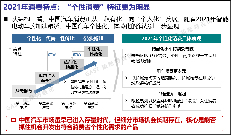 2021年消費特點:“個性消費”特征更為明顯。從結(jié)構上看,中國汽車消費正從“私有化”向“個人化”發(fā)展,隨著2021年智能電動車的加速滲透,中國汽車個性化、體驗化的消費進一步顯現(xiàn)。中國汽車市場雖早已進入存量時代,但細分市場機會長期存在,核心是能否抓住機會開發(fā)出符合消費者個性化需求的產(chǎn)品。