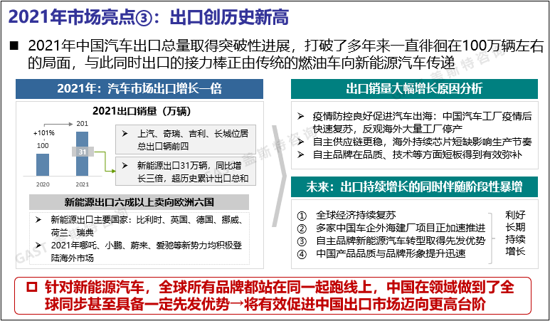 2021年市場亮點三:出口創(chuàng)歷史新高。2021年中國汽車出口總量取得突破性進展,打破了多年來一直徘徊在100萬輛左右的局面,同時出口的接力棒正由傳統(tǒng)的燃油車向新能源汽車傳遞。針對新能源汽車,全球所有品牌都站在同一起跑線上,中國在領域做到了全球同步甚至具備一定先發(fā)優(yōu)勢→將有效促進中國出口市場邁向更高臺階。