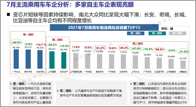 主流乘用車車企分析:總體來看,多家自主車企表現(xiàn)亮眼,長安、奇瑞、長城、比亞迪等自主車企均有不同程度增長,比亞迪近一年首次入圍TOP15,其中新能源車增量貢獻達25%。受芯片短缺等因素持續(xù)影響,7月南北大眾銷量同比呈現(xiàn)大幅下滑,而以本田為代表的日系車企同樣受此影響降幅較大。