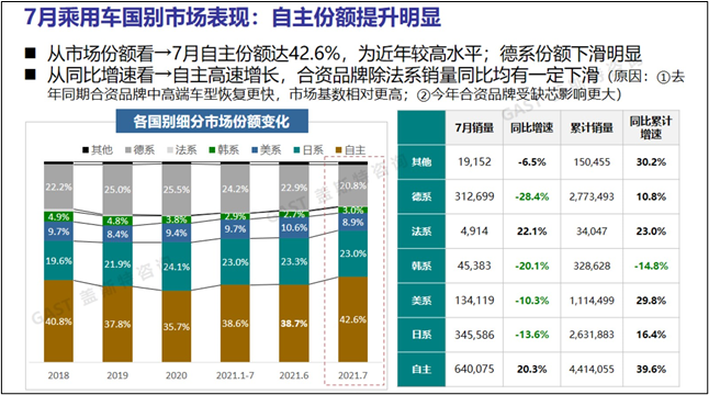 乘用車國別市場表現(xiàn):從同比增速看,自主品牌高速增長,合資品牌除法系銷量同比均有一定下滑,主要是由于去年同期合資品牌中高端車型恢復更快,市場基數(shù)相對更高,以及今年合資品牌受缺芯影響更大。從市場份額看,7月自主品牌份額達42.6%,為近年較高水平,而德系品牌份額下滑明顯。